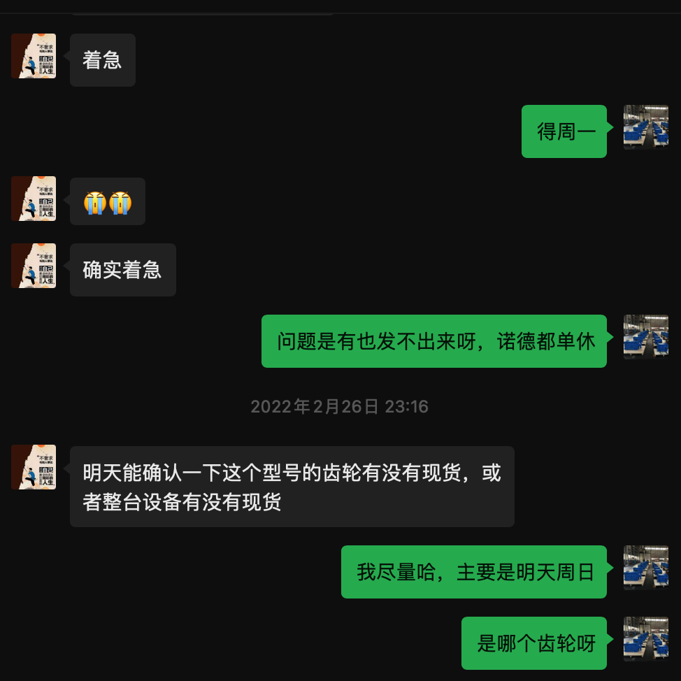 2022年2月26日23:10西安某客户急需诺德SK7027V减速机配件,那天刚好是周末,诺德NORD减速机工厂周末不上班,所以只好说得等周一确定,客户要求周日确定有没有现货,由于这个是老朋友,所以周日拖售后技术确定是有现货的,2月28日上午确定价格随后签订合同,下午我就赶往苏州工厂提货,由于五点后到达苏州工厂,货提不出来,只好等第二天3月1日早上提货,随后3月1日早上九点拿到货,由于客户想和我见一面,所以直接从苏州赶往西安送货,下午三点出发,知道3月2日下午一点到达,客户见到货后非常满意,感谢客户信任。
